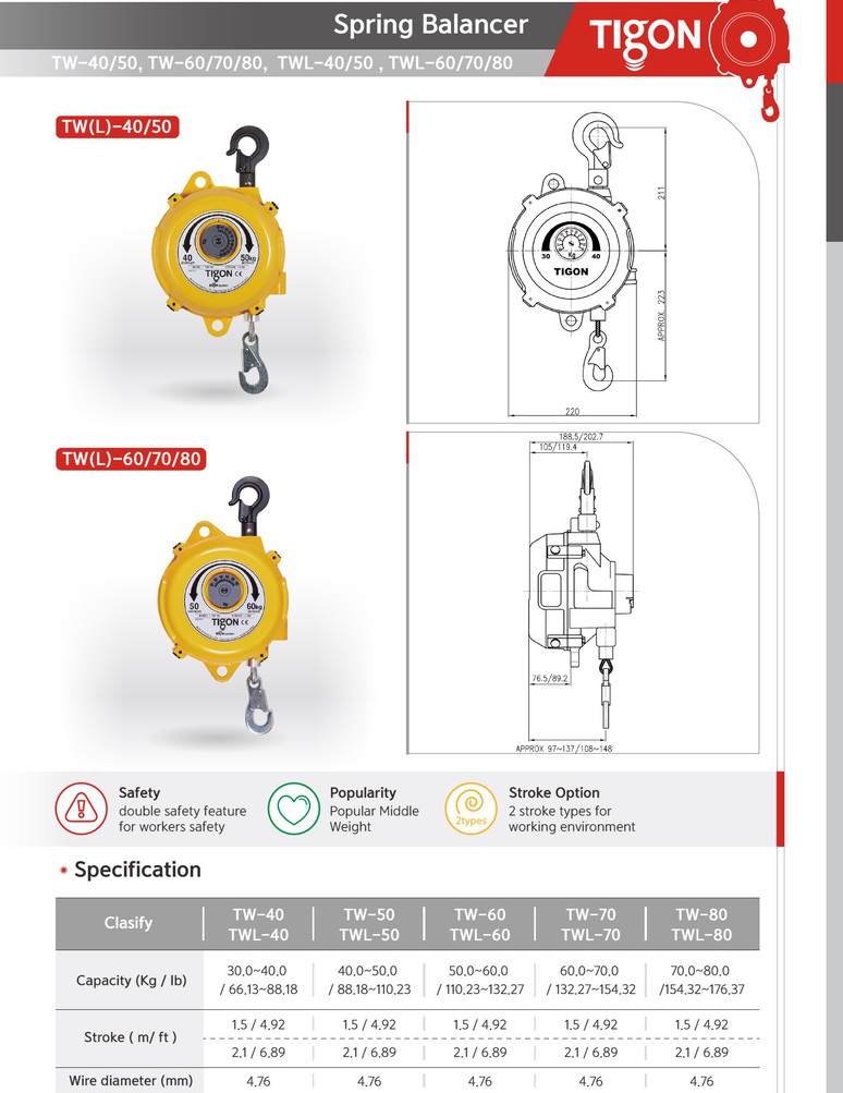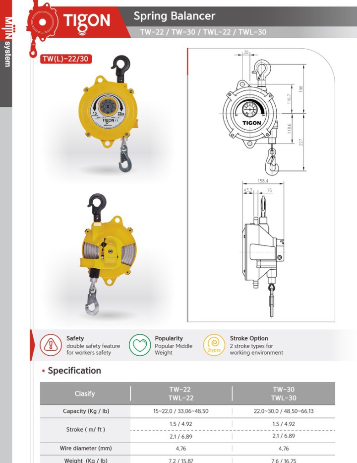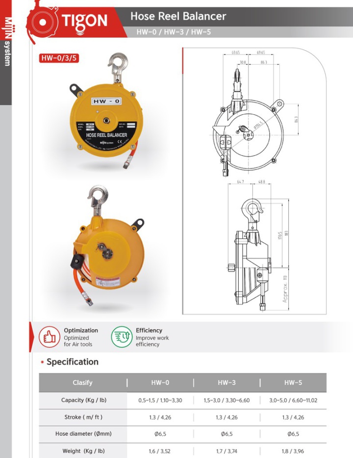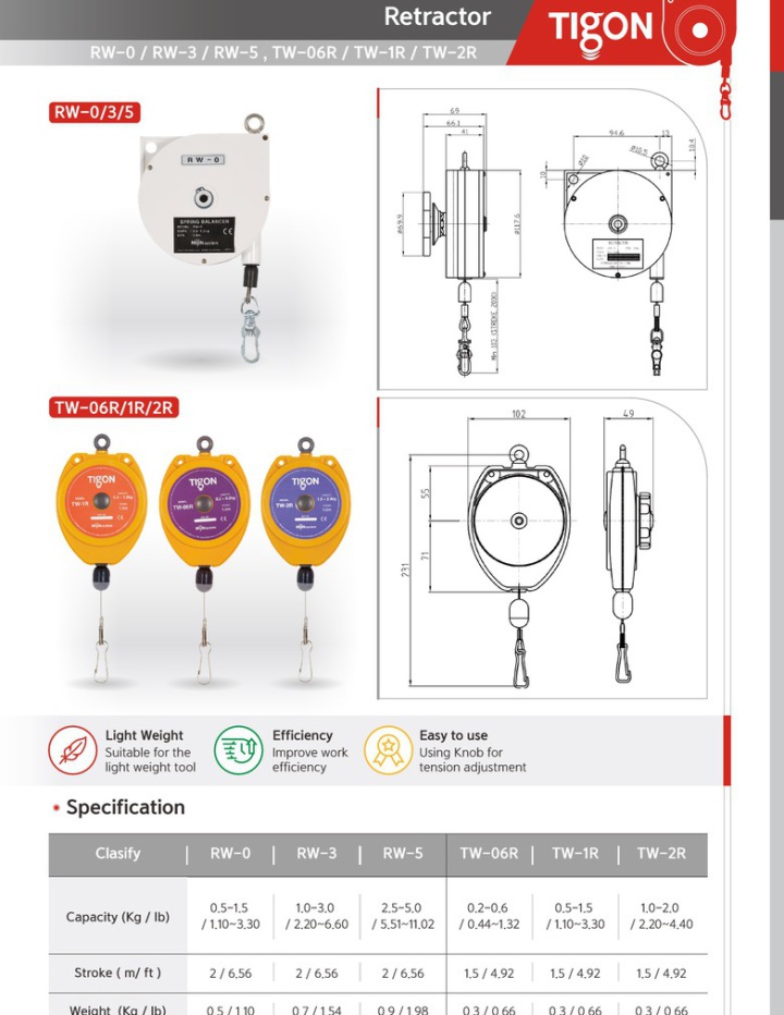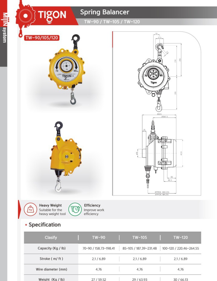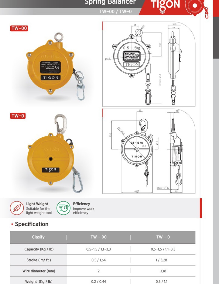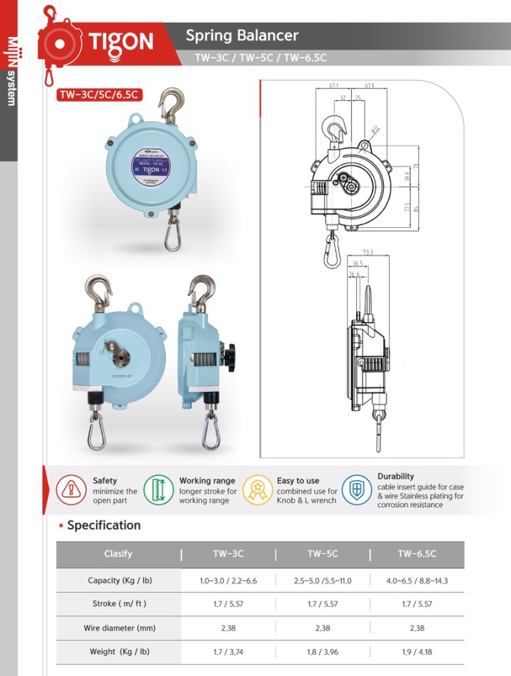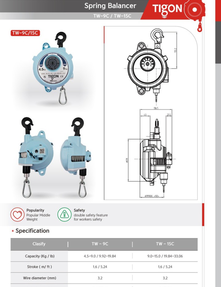Typically used on an assembly line, the spring balancer suspends heavy tools through cable tension. This makes the tool feel essentially weightless and easier and lighter to operate by extending or retracting the support cable to follow its movement.